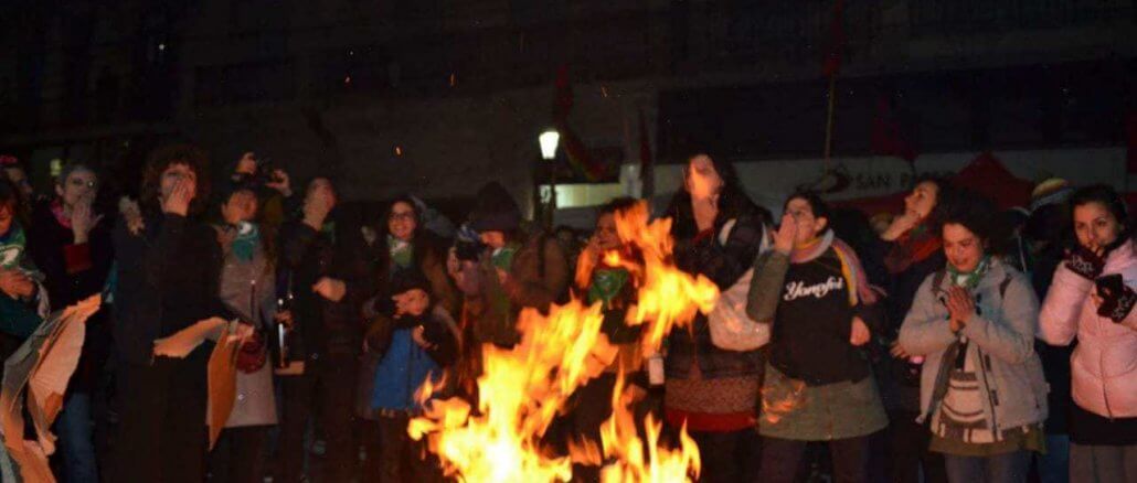 La revuelta festiva callejera es un caldero donde arden los mandatos que nos ordenan como debemos vivir a la vez que entre sus llamas se originan las fuerzas de las vidas que si queremos abrazar. Las calles nunca son las mismas, porque van tomando las formas de nuestras revueltas. Hoy las calles son nuestras. En ellas nos acuerpamos ante el desamparo de la acumulación capitalista, patriarcal y neoliberal. Nos auto-cuidamos. Improvisamos nuestros repertorios de canticos y frases. Estampamos en las telas y remeras las consignas como mantras. Nos maquillamos con brillantinas y colores. Cocinamos altos guisos. Armamos fuegos para repararnos del frio. Conversamos. Nos reímos. Soñamos. Nos abrazamos y bailamos. Agitamos la furia que mutamos en deseos. Hacemos del estar entre nosotras una fiesta. Una gran casa de afectos. Así, ponemos en acto otros modos de vivir. ¿Acaso es otra cosa la revolución?