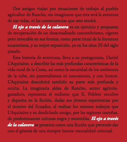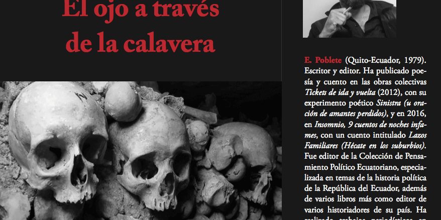 La novela de Esteban Poblete, El ojo a través de la calavera, viene a ocupar un lugar inquietante en la narrativa ecuatoriana actual. Justamente con su lectura podemos cuestionarnos: ¿qué es lo contemporáneo?, o de manera más sencilla plantearnos: ¿se es contemporáneo a qué?
