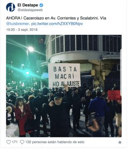 La gente salió a protestar en distintos puntos de Buenos Aires por la grave crisis económica que provocó el macrismo y que ahora se acrecentan por la fuerte devaluación.