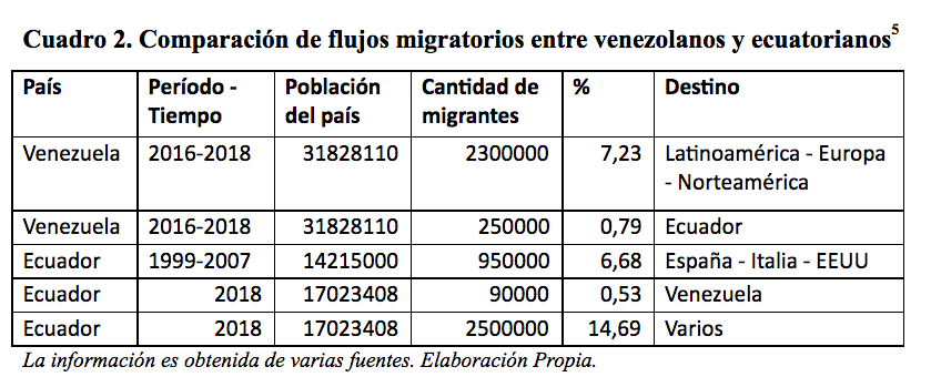Información tomada de ecuadorinmediato.com 23-08-2018, de donde se recaba información de la Senami (Secretaria Nacional del Migrante – Cancillería del Ecuador)[/note] se encontrarían fuera del país en el 2018 (14,69%). Organismos internacionales dan la cifra de 2´300.000[note]Información tomada de la página de ACNUR 23-08-2018[/note] venezolanos fuera de su territorio (7,23%), esta primera premisa nos indica que hay más ecuatorianos fuera de Ecuador, que venezolanos fuera de Venezuela, en los dos casos salieron por razones económicas.