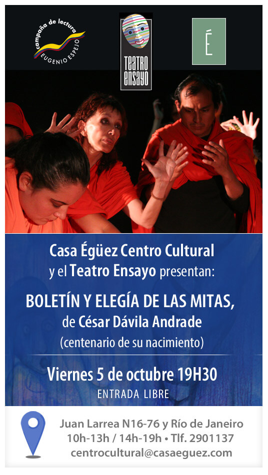 El 5 de octubre de 1918 nació César Dávila Andrade en la ciudad de Cuenca. Al cumplirse 100 años de su nacimiento, el centro cultural Casa Égüez (Juan Larrea y Río de Janeiro) le rendirá homenaje con la presentación teatral de Boletín y elegía de las mitas, obra mayor de la lírica ecuatoriana, a cargo del grupo Teatro Ensayo, dirigido por Antonio Ordóñez.