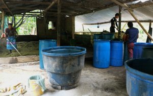 El laboratorio, que queda a dos metros de la carretera, está repleto de tarros plásticos de 50 kilos, el techo es de eternit y está sujeto por guadua, hay motos parqueadas a un costado, y no mide más de once metros de ancho.