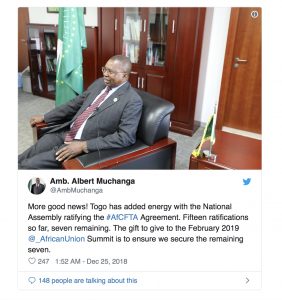 «¡Más buenas noticias! Togo ha dado impulso con la Asamblea Nacional al ratificar el acuerdo del AfCFTA. Por ahora hay 15 ratificaciones, faltan siete. El mejor regalo para la cumbre de la Unión Africana, en febrero de 2019, es asegurarnos de obtener estas ratificaciones», comunicó en Twitter el comisario para Comercio e Industria de la Unión Africana, Albert Muchanga.