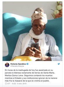 La historia se repite: En la madrugada del 6 de enero, hombres desconocidos y armados irrumpieron en una finca de la vereda San Isidro, zona rural de Bonda de la ciudad de Santa Marta, en donde se encontraba la lideresa social Maritza Quiroz Leiva, la asesinaron fríamente, aunque la Corte Constitucional había solicitado protección para su vida.