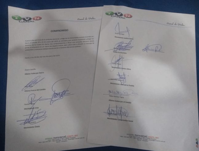 Ocho de la noche. 29 de enero. Gotas saltan de los cables eléctricos a las cochas en las veredas. Frescor. Hotel Ajavi, cuatro estrellas. Sus pasillos internos conducen a dos salones: el uno espacioso, el otro pequeño, muy iluminado. Allí, 9 candidatos a la alcaldía de Ibarra esperaban para poner con su puño y letra un acuerdo de campaña “limpia”, organizada por TVN que se transmitiría en vivo por Facebook.