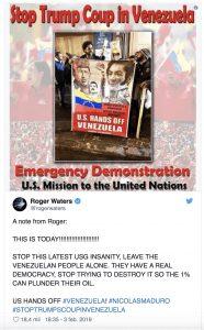 El mensaje publicado vía Twitter por Waters dice: “Esto es hoy!!!!!!!!!!!!!!!!!!!!!! Detengan esta nueva locura de Estados Unidos, dejen al pueblo venezolano tranquilo. Ellos tienen una verdadera democracia, paren el intento de destruirlo para que el 1 % pueda saquear su petróleo”. Y más abajo agrega la consigna “Las manos de Estados Unidos fuera” acompañada de los hashtag #Venezuela! Nicolás Maduro y #STOPTRUMPSCOUPINVENEZUELA (alto al golpe de Trump en Venezuela).
