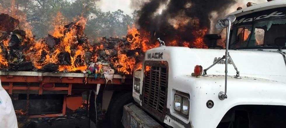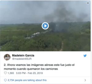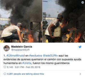 Según relata TeleSur, testigos de lo ocurrido afirmaron que grupos violentos de la oposición venezolana incendiaron los camiones con bombas Molotov y luego intentaron inculpar a la Guardia Nacional Bolivariana (GNB) y a la Policía Nacional Bolivariana (PNB).