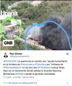 Desde el lado colombiano del puente se estacionaron cuatro camiones que transportaban la ayuda humanitaria que aportaba la agencia norteamericana USAID que tiene estrechos vínculos con la agencia de inteligencia CIA. Durante la tarde y de repente dos de esos fueron quemados.