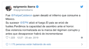 Finalmente Ibarra expresó que esta violencia heredada por Felipe Caldeŕon y Enrique Peña Nieto podría incrementarse previo a la pacificación del país.