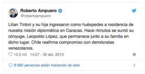 El Ministro de Relaciones Exteriores de Chile, Roberto Ampuero informó mediante las redes sociales el ingreso del líder opositor Leopoldo Lopez y su familia.