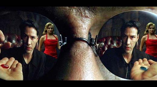 Sin embargo, se distrae al ver a una hermosa mujer caminando hacia él con un vestido rojo y ella realmente se destaca entre las personas de traje oscuro. Morpheus luego le pregunta a Neo si lo estaba escuchando, o si estaba mirando a la mujer del vestido rojo. Neo duda un momento y cuando se da la vuelta para mirar a la mujer, se encuentra cara a cara con un agente que le está apuntando con un arma a la cabeza.