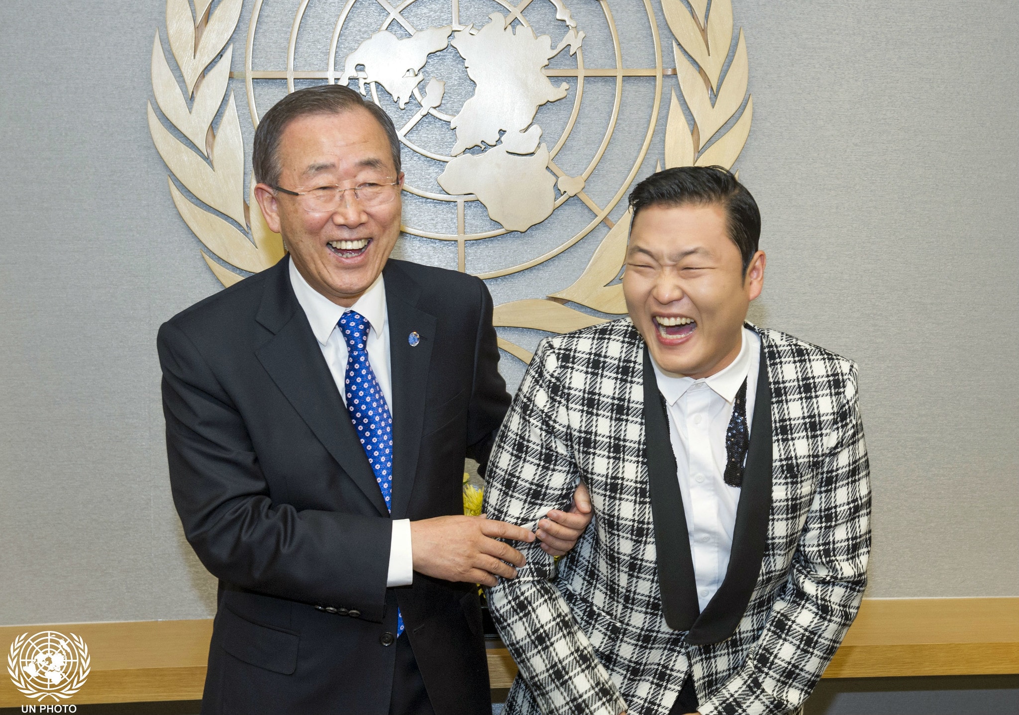 El ex secretario general de Naciones Unidas, Ban Ki-moon, recibe al artista coreano PSY en Nueva York. Fuente: ONU