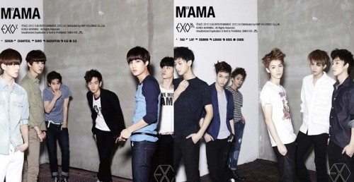 Carátulas de los EP de Mama (2012), del grupo EXO. A la izquierda, la versión en coreano (EXO-K); a la derecha, en mandarín (EXO-M). Además de parecerse físicamente los ídolos de ambas versiones de la banda, los videoclips y las canciones son iguales, pero en diferente lengua, una maniobra común en el mundo del k-pop para llegar a un público más amplio. Fuente: The Urban Pop