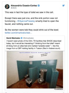 Según informan varios medios norteamericanos, los congresistas aseguraron que en algunas celdas no hay agua, duermen en sacos de dormir en el suelo y los niños son apartados de sus familias. «Este es el tipo de baño que vimos en la celda. Excepto que sólo había uno y el lavabo no funcionaba. Ayanna Pressley [otra congresista] intentó abrir el grifo y no salió nada. Así que les dijeron a las mujeres que podían beber de la taza», aseguró la congresista Alexandria Ocasio-Cortez en Twitter. Asimismo, denunció que los oficiales sólo permitieron que se ducharan cuatro días antes de la visita, tras quince días sin poder hacerlo.