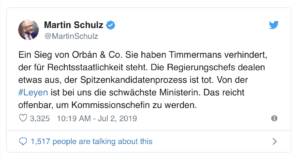 «Es una victoria de Orbán y compañía. Se han opuesto a Timmermans, quien defendía el Estado de Derecho. Los jefes de Gobierno están matando el proceso de los spitzenkandidaten con Von der Leyen, que era la ministra más débil», ha tuiteado Schulz.