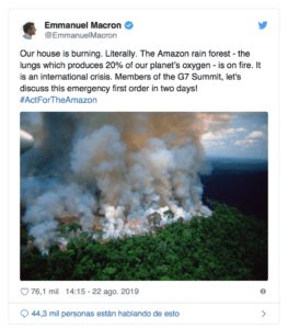 El mandatario francés describió el aumento de los incendios en la selva amazónica como una «crisis internacional» y este mismo miércoles anunció que los líderes del G7 discutirán el tema en la cumbre. «Nuestra casa arde. Literalmente. La Amazonía, el pulmón de nuestro planeta y que produce el 20 por ciento de nuestro oxígeno está en llamas», advertió Macron en Twitter.