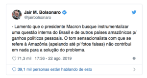 A todo esto, Bolsonaro señaló en la misma red social que: «El Gobierno brasileño permanece abierto al diálogo, basado en datos objetivos y respeto mutuo. La sugerencia del presidente francés de que los asuntos amazónicos se discutan en el G7 sin la participación de los países de la región evoca una mentalidad colonialista equivocada en el siglo XXI«.