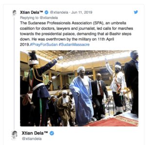 Ola Idris, activista sudanesa que vive en Canadá, actualiza su perfil de Twitter cada día con las últimas noticias de las protestas. Piensa que el uso de las redes sociales están “más allá de cualquier límite”: “Permite que la revolución sea visible, presiona a los gobiernos internacionales que están apoyando las muertes de ciudadanos sudaneses y permite que el movimiento conecte”, argumenta. Tras el ataque sufrido por los militares el 3 de junio que dejó hasta cien muertos, el régimen bloqueó internet sin éxito durante días. “Después del bloqueo en Sudán, el movimiento externo a Sudán creó una campaña en las redes sociales que ganó la atención del mundo y alcanzó casi cualquier esquina de internet”, añade Dinan Saeed, activista sudanesa que comparte información a partir de su perfil de Twitter.
