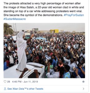 No es la primera vez que la revolución sudanesa capta la atención internacional. La primera de ellas alcanzó la fama gracias a la imagen de Lana Haroum’s de la “reina nubia”: Alaa Salah, la joven estudiante de Ingeniería y Arquitectura que hablaba a la multitud desde lo alto de un coche ataviada con un tobe, el vestido blanco utilizado por las mujeres sudanesas trabajadoras durante las revoluciones de los años 70. Su fotografía recorrió las redes sociales como la pólvora y enseñó la fuerza de las jóvenes sudanesas, que desde el inicio han mostrado su apoyo hacia la revolución en un país particularmente opresivo hacia las mujeres.
