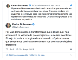 El segundo más grande de los hijos del presidente Jair Bolsonaro –considerado su principal asesor comunicacional y el que maneja las redes sociales del Palacio del Planalto– afirmó en su cuenta de Twitter que “el gobierno viene deshaciendo absurdos que nos llevaran al limbo y trata de arreglarnos el eje. El relato de ciertos grupos y sus razones cada vez más clara$ lamentablemente son rápidamente absorbidos por inocentes. Los avances ignorados y los malhechores olvidados”.