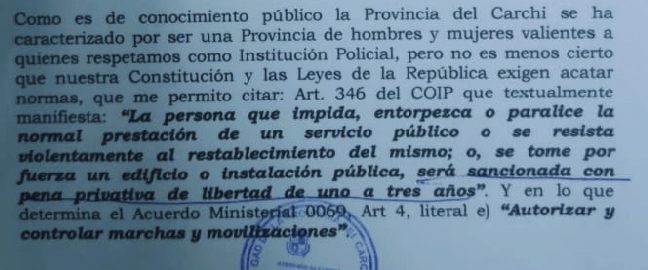 Por su parte por medio de una carta la Policía Nacional advierte a los líderes del paro provincial que «la persona que…se tome por la fuerza un edificio o instalación pública, será sancionada con pena privativa de uno a tres años» Más adelante la carta añade, «Eviten en todo momento…cierre de vías, o algún otro hecho que involucre la actuación de la Ley».