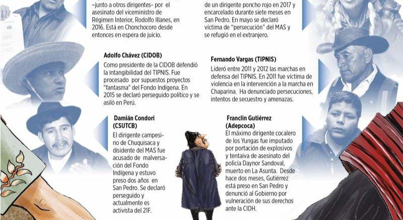 Desde 2010, al menos ocho líderes indígenas se han declarado perseguidos políticos del gobierno del MAS: Cancio Rojas, Félix Becerra, Fernando Vargas, Damian Condori, Carlos Mamani, Adolfo Chávez, Elsner Larrazabal y Franclin Gutiérrez. Todos ellos –representantes de tierras altas o bajas, mineros o campesinos– se opusieron al oficialismo; después fueron acusados de algún delito, encarcelados y procesados penalmente.