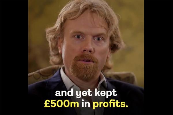 Las deudas de algunas compañías con contratos de leasing también se muestran en este vídeo a sus potenciales votantes, como Great Western Railway, que debía 800 millones de libras al gobierno y en lugar de pagarlas, decidió romper el contrato, del que todavía le quedaban tres años. El regalo del gobierno Tory fue reducir su deuda en 32 millones de libras. Tras poner otros ejemplos, el ficticio multimillonario Branson dice que “con el gobierno Tory este chollo puede continuar eternamente”.