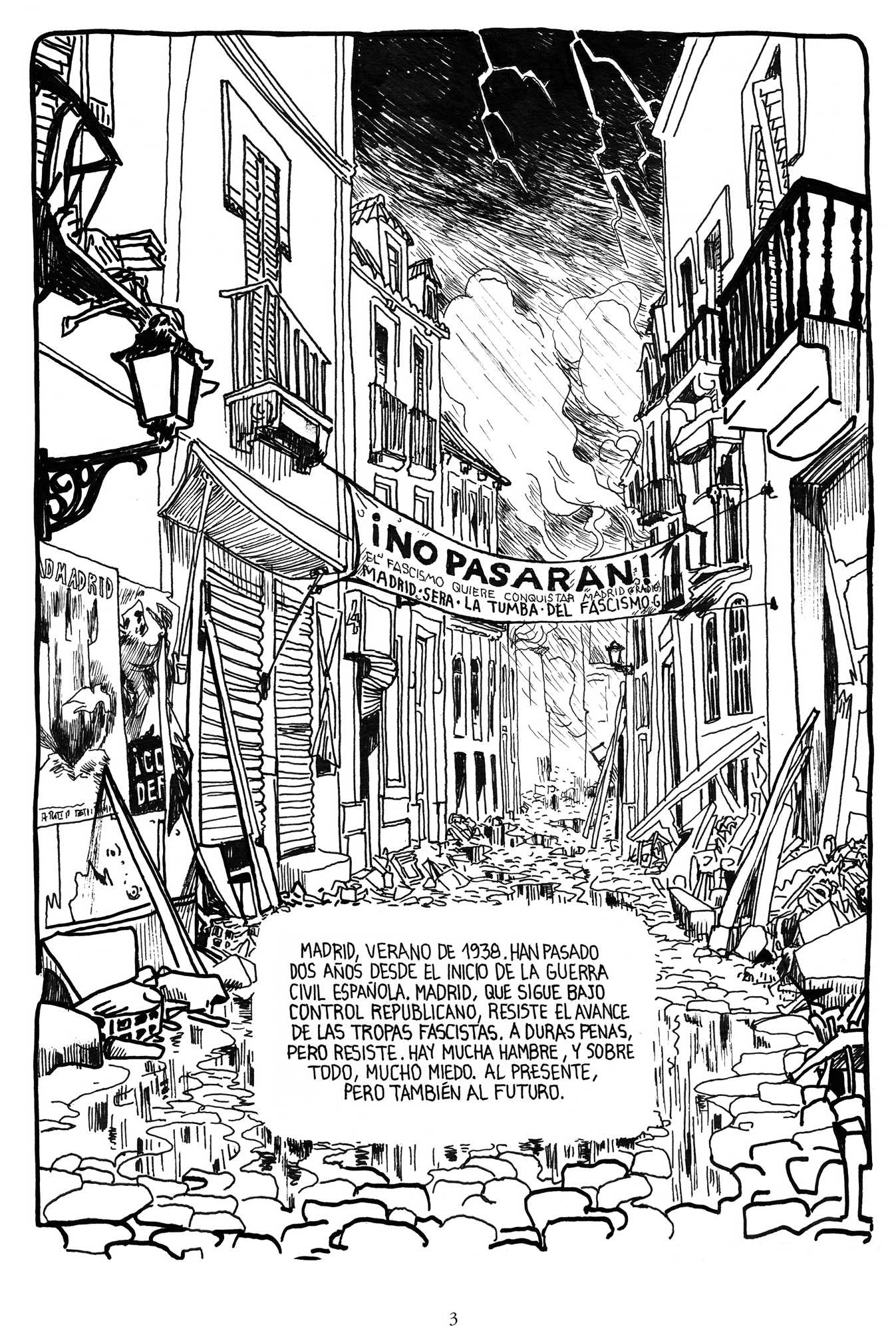 «Pero, vamos, en la novela gráfica más que retratar Madrid, retratamos una plaza, un único espacio, que podía ser cualquier plaza o barrio bombardeado de la ciudad. De hecho, una de las primeras decisiones que tomé con respecto al dibujo fue construir una maqueta de ese espacio concreto para facilitar cuestiones de dibujo» -añade el dibujante-.