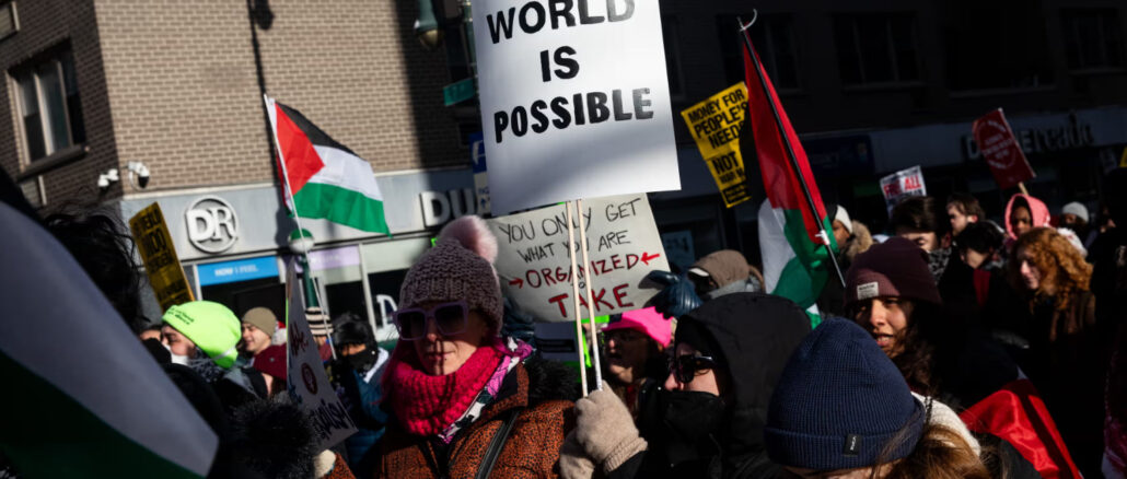 Comienza diciendo que en los primeros cuatro meses de este año, se han presentado 41 proyectos de ley contra las protestas en 22 estados, en comparación con un total de 52 en 2024 y 26 en 2023, según el rastreador del Centro Internacional para el Derecho sin Fines de Lucro. Según la autora, se trata de castigos penales contra protestas pacíficas protegidas por la Constitución, dirigidas contra estudiantes universitarios, manifestantes contra la guerra y activistas climáticos con duras penas de prisión y fuertes multas, una represión que los expertos advierten que amenaza con erosionar los derechos de la primera enmienda a la libertad de expresión, reunión y petición (https://goo.su/QPKb9).