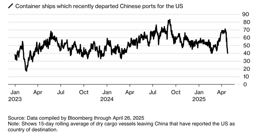 La principal causa de este impacto en la oferta es evidente en Asia. Actualmente, unos 40 buques de carga hicieron escala recientemente en puertos de China y ahora se dirigen a EEUU, lo que representa una disminución de aproximadamente el 40 % con respecto a principios de abril, según el seguimiento de buques compilado por Bloomberg.