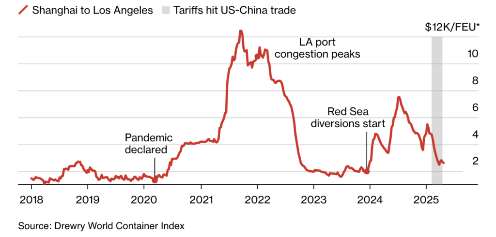 Las tarifas de envío se desploman debido a la contracción del comercio entre EEUU y China.