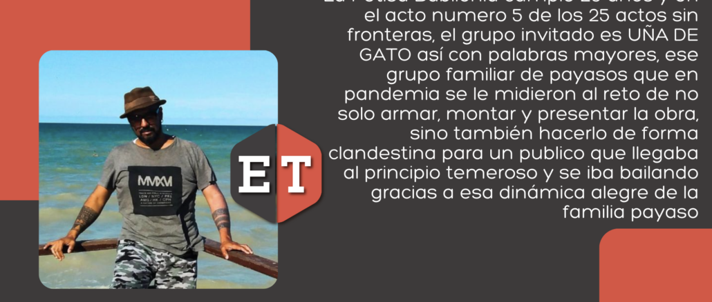 La Petisa Babilonia cumple 25 años y en el acto numero 5 de los 25 actos sin fronteras, el grupo invitado es UÑA DE GATO así con palabras mayores, ese grupo familiar de payasos que en pandemia se le midieron al reto de no solo armar, montar y presentar la obra, sino también hacerlo de forma clandestina para un publico que llegaba al principio temeroso y se iba bailando gracias a esa dinámica alegre de la familia payaso, a su profesionalismo, a su garra que hizo o logro con La Panchita Naranjas, darle el sabor que era necesario para llevar a escena la pieza.