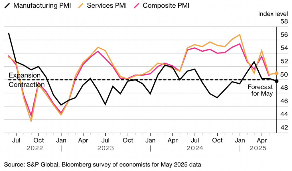 Si bien los datos de China corresponden a abril, las cifras del PMI de S&P Global corresponden a mayo y ofrecen una perspectiva inicial de la actividad en economías como Australia, Japón, la eurozona, el Reino Unido y Estados Unidos. El calendario de recopilación de estas encuestas implica que reflejarán la desescalada arancelaria acordada entre Washington y Pekín tras las conversaciones en Suiza.