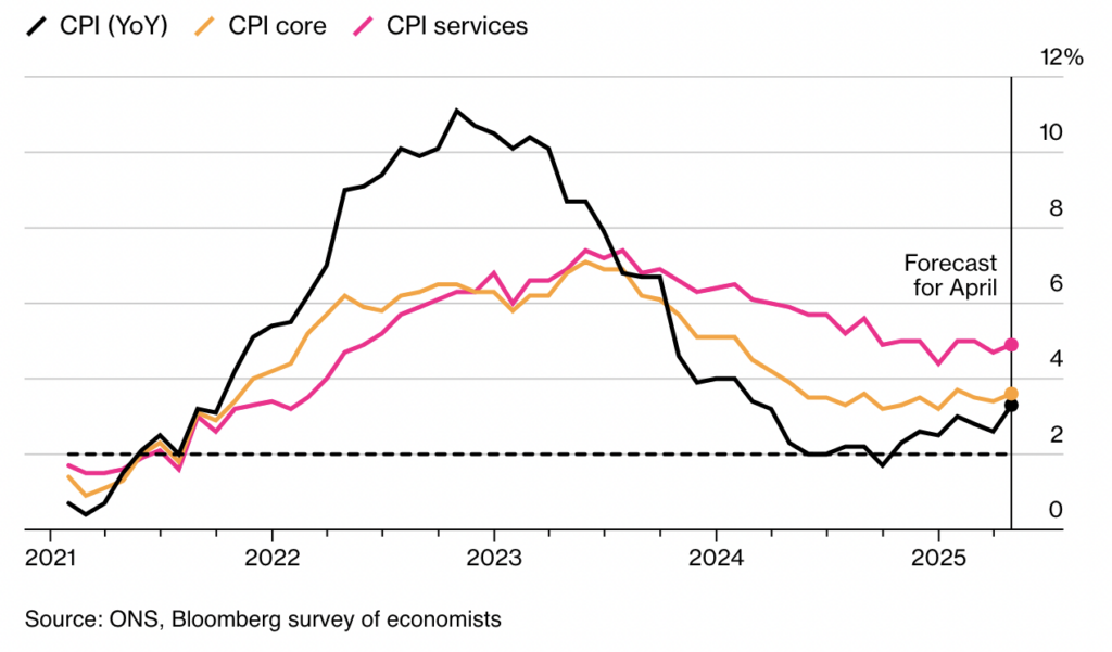La inflación en el Reino Unido del miércoles será un punto destacado. Todos los economistas encuestados por Bloomberg estiman que el crecimiento anual de los precios al consumidor se aceleró en abril, con una previsión mediana del 3,3 %, la más rápida en más de un año, tras un aumento en los costes de la energía regulada.