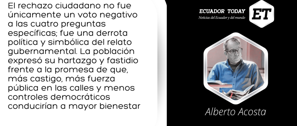 El rechazo ciudadano no fue únicamente un voto negativo a las cuatro preguntas específicas; fue una derrota política y simbólica del relato gubernamental. La población expresó su hartazgo y fastidio frente a la promesa de que, más castigo, más fuerza pública en las calles y menos controles democráticos conducirían a mayor bienestar. En ese sentido, la consulta no fracasó por falta de pedagogía, como sostuvo el oficialismo, sino porque evidenció una brecha creciente entre el gobierno y una sociedad que comenzaba a percibir la securitización permanente como parte del problema y no de la solución. El “no” fue, ante todo, un límite político impuesto desde abajo. El pueblo demostró que la diversidad, la creatividad y el compromiso son base potente para acciones transformadoras. En esa gran minga democrática se priorizó el bien común. Se marginaron los individualismos y los egoísmos. Así, este triunfo popular sobre los intentos de profundizar el proyecto liderado actualmente por Noboa no puede ser asumido por ningún grupo político, ni ningún caudillo en particular.