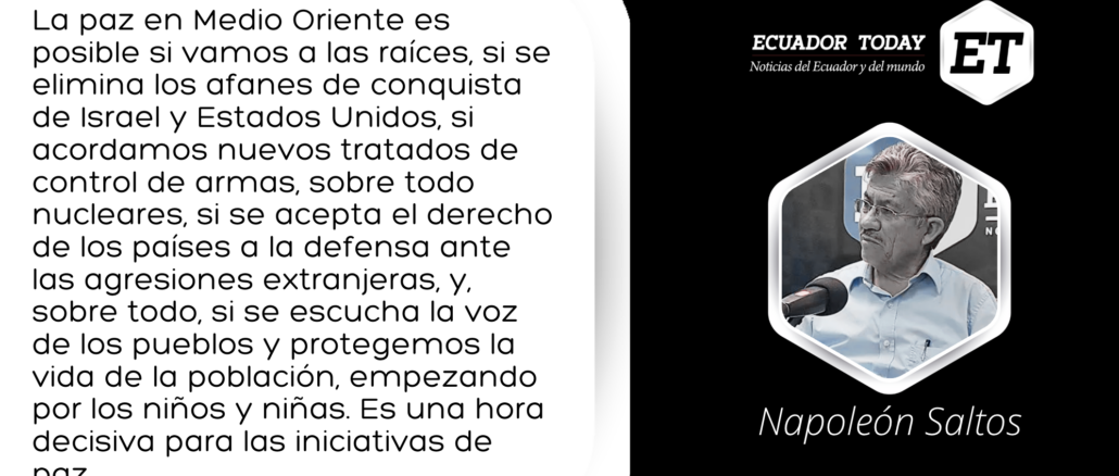 La paz en Medio Oriente es posible si vamos a las raíces, si se elimina los afanes de conquista de Israel y Estados Unidos, si acordamos nuevos tratados de control de armas, sobre todo nucleares, si se acepta el derecho de los países a la defensa ante las agresiones extranjeras, y, sobre todo, si se escucha la voz de los pueblos y protegemos la vida de la población, empezando por los niños y niñas. Es una hora decisiva para las iniciativas de paz.
